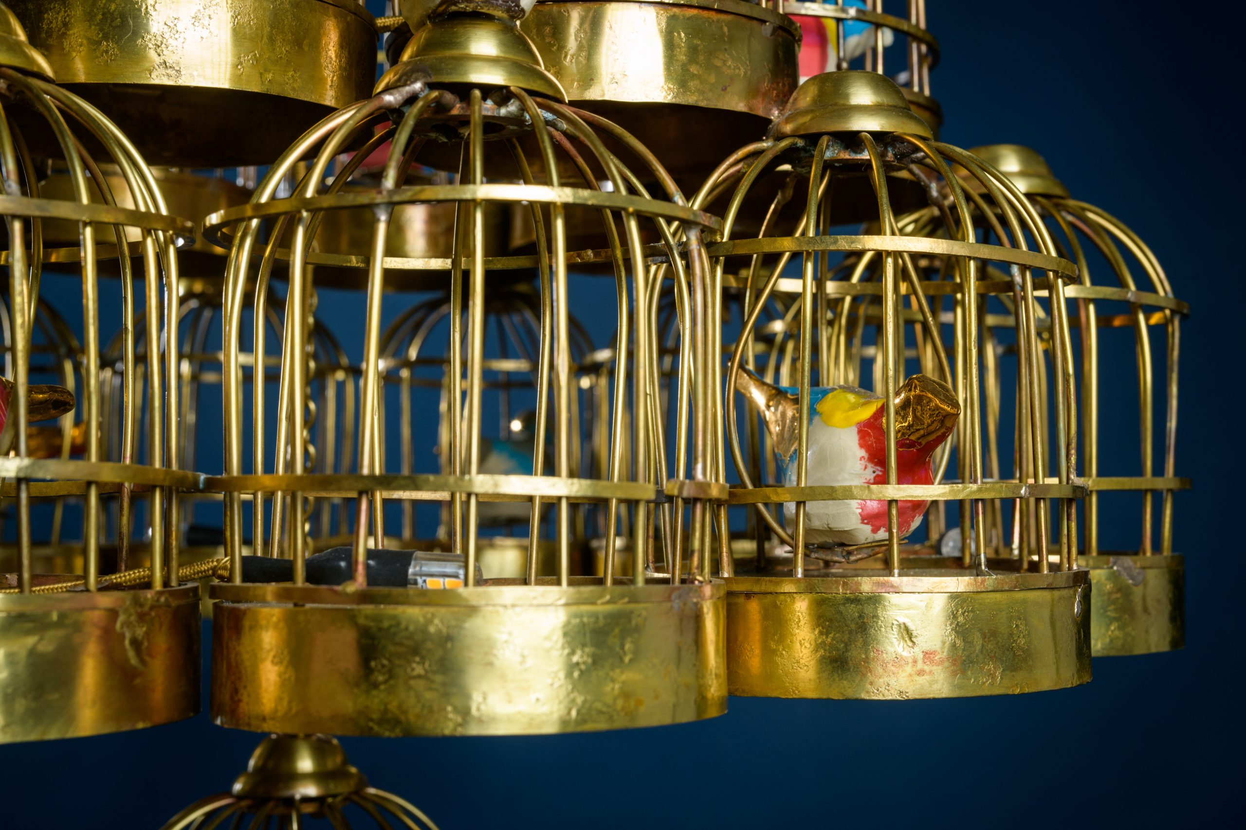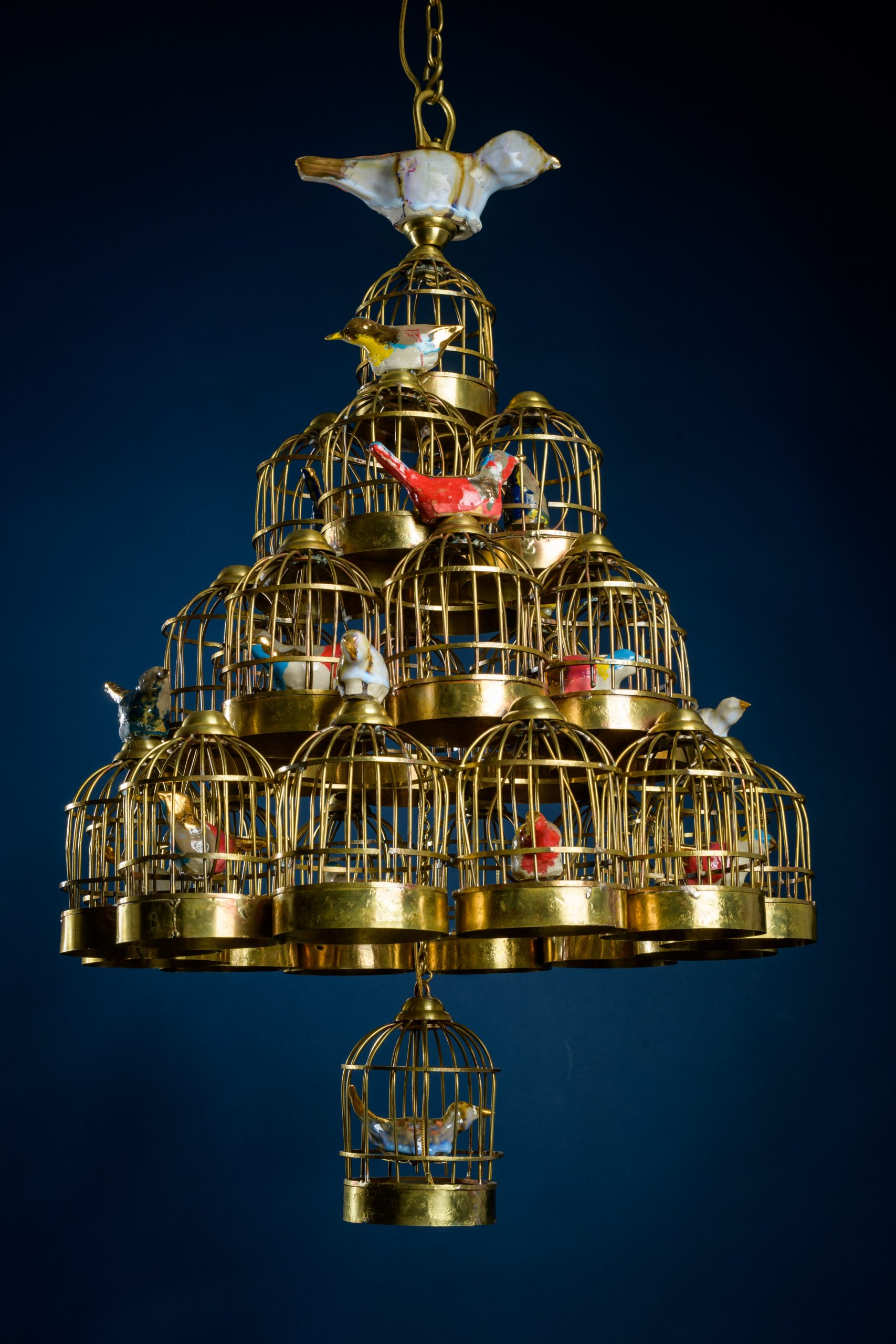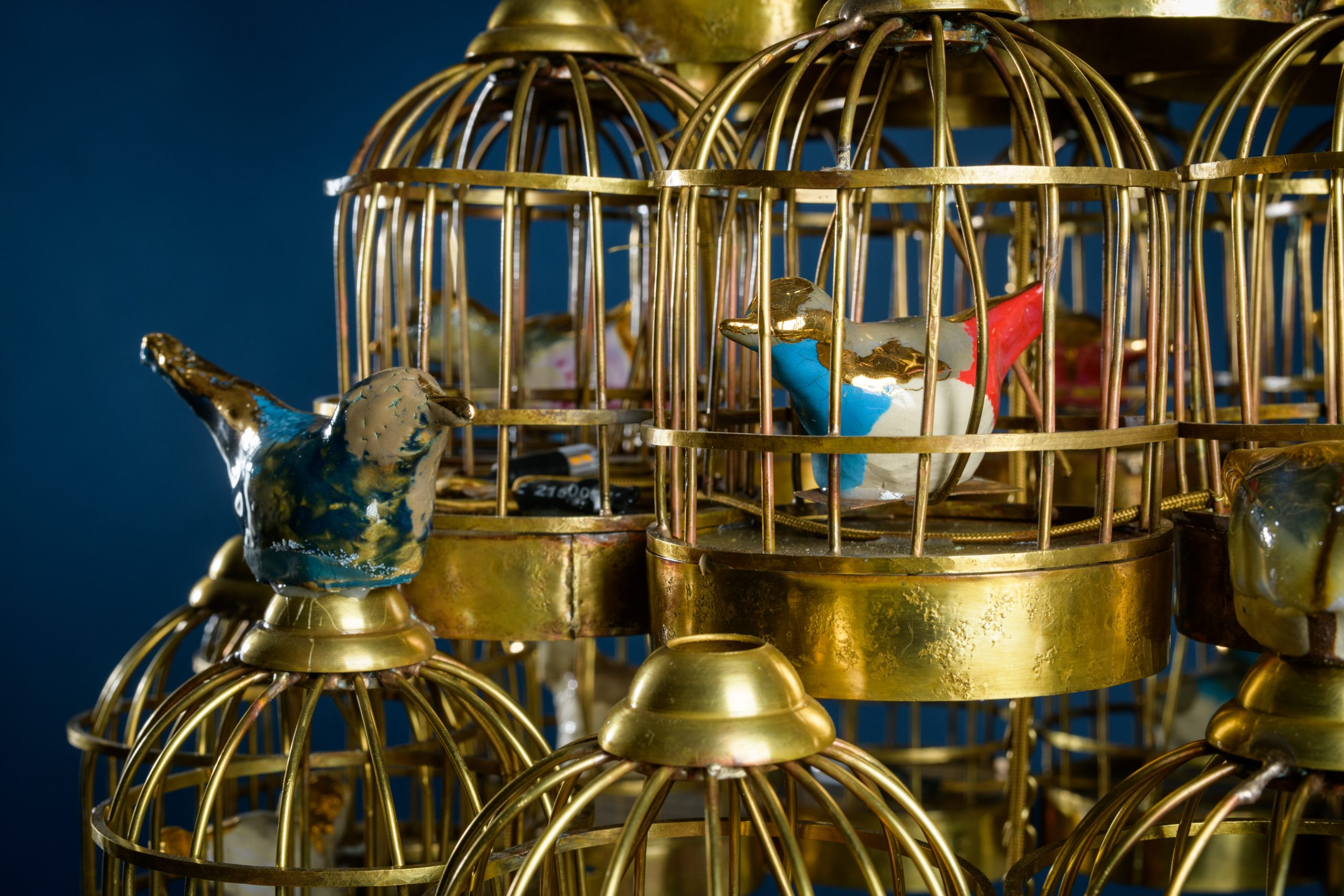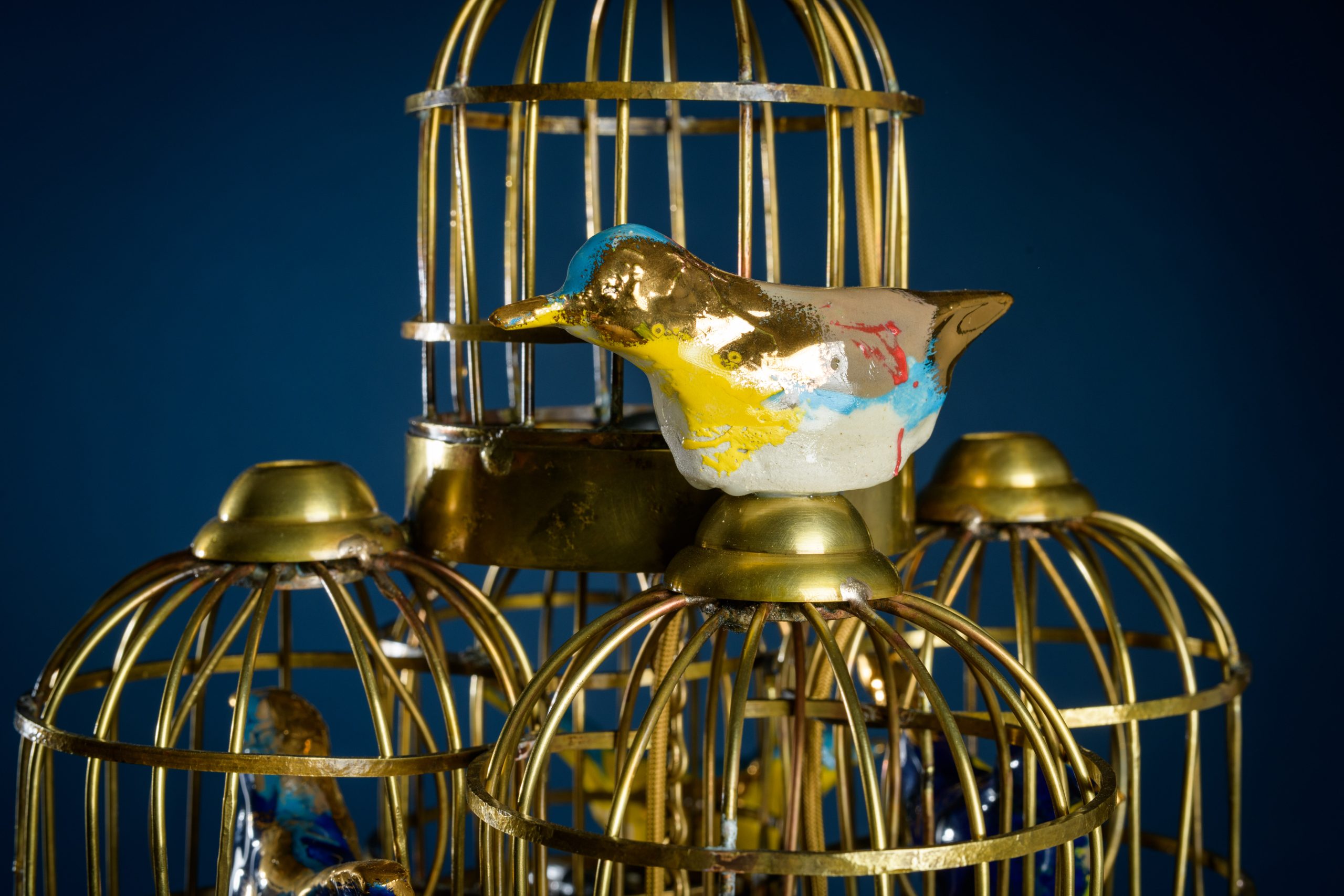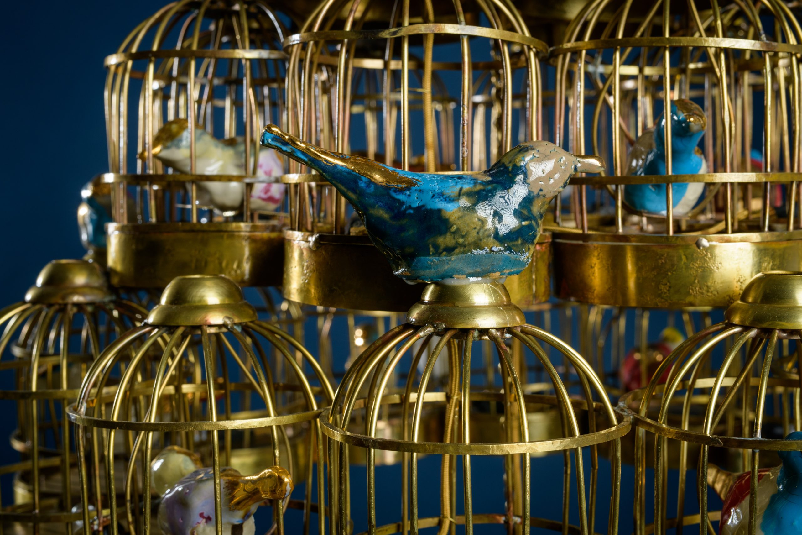 These birds locked in a pretty gilded cage speak to us of our human condition, always caught between confinement and the desire for freedom.
