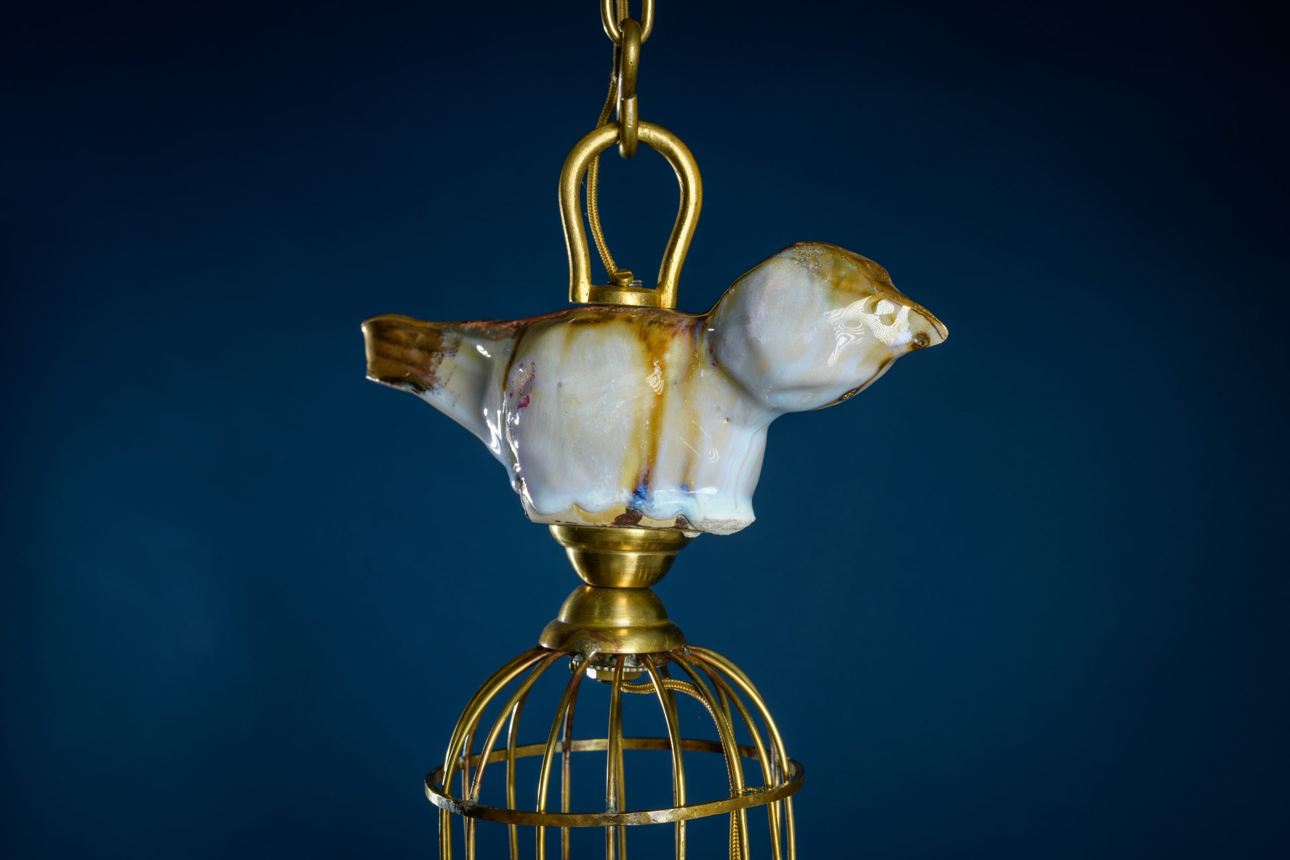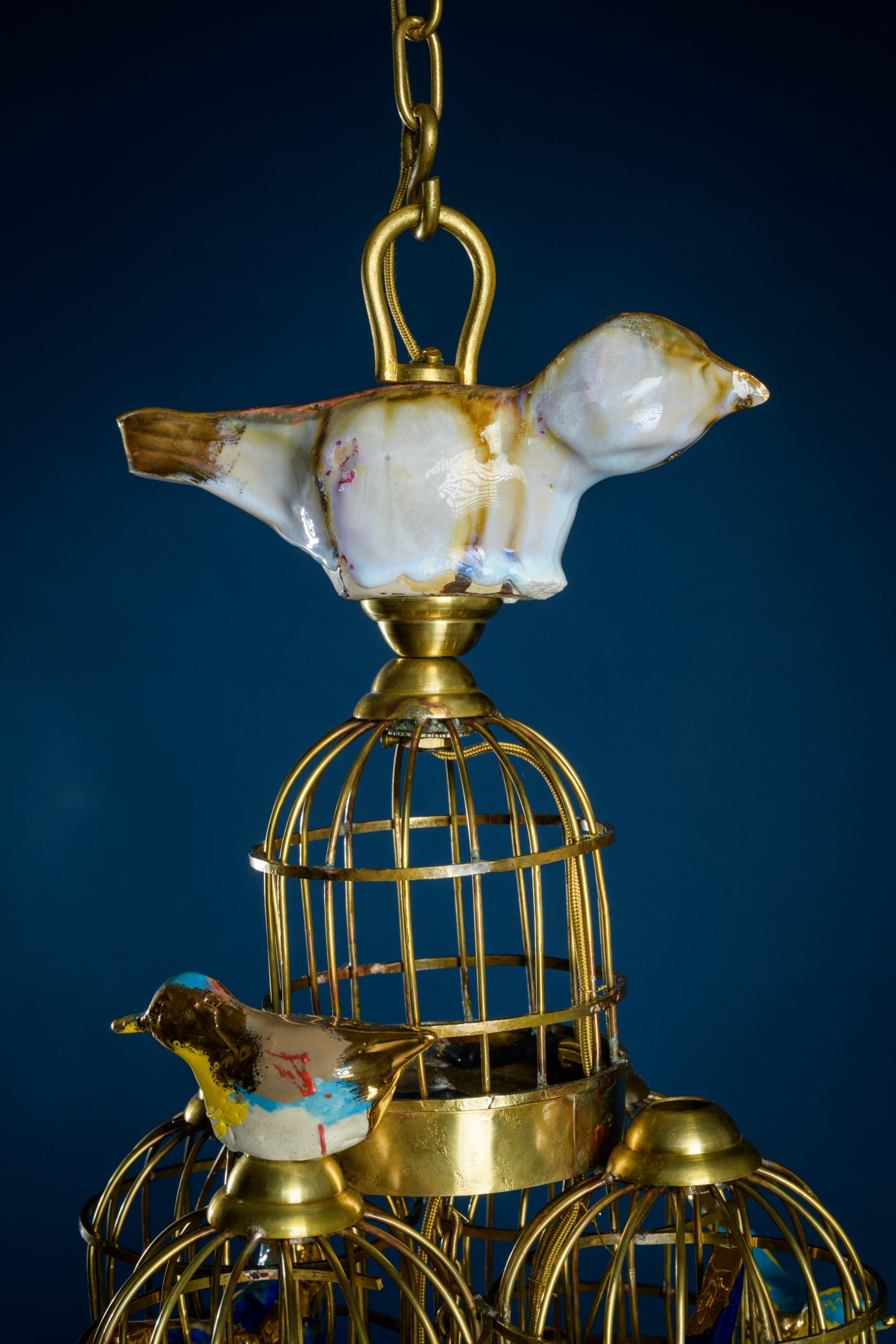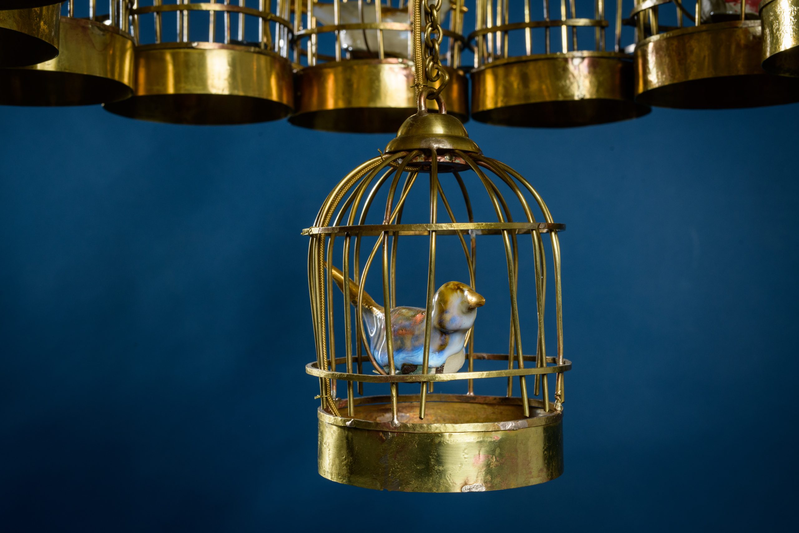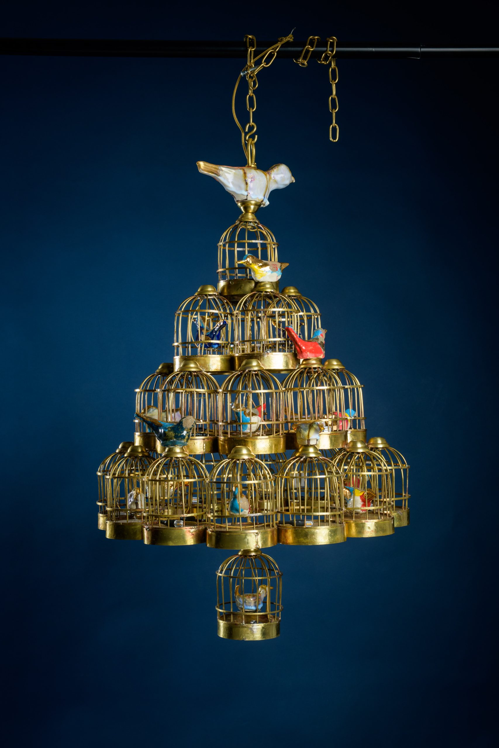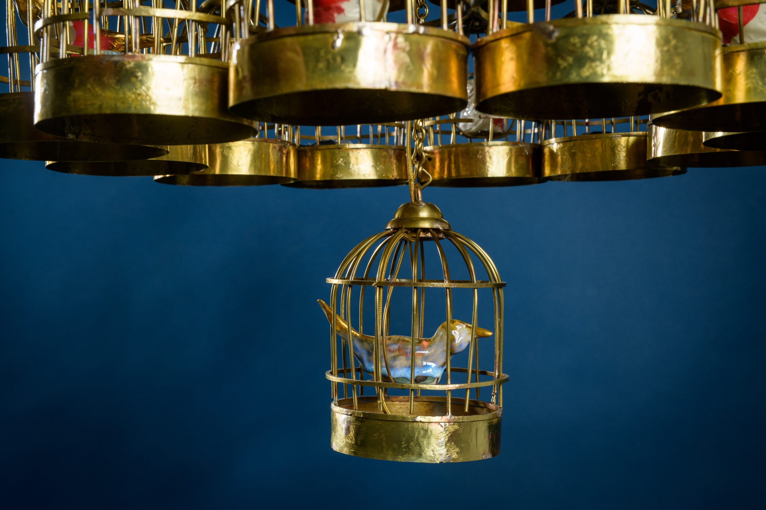 These birds locked in a pretty gilded cage speak to us of our human condition, always caught between confinement and the desire for freedom.